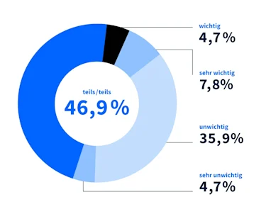 Die Energieeffizienz der Immobilie spielt bei der Kaufentscheidung von Immobilieninteressenten in der Wahrnehmung der meisten Befragten eine teils/teils Rolle (46,9 %). Während einige Befragte (insgesamt 12,5 %) die Energieeffizienz als sehr wichtig oder wichtig erachten, ist sie für eine signifikante Anzahl von Befragten (40,6 %) als unwichtig oder sogar sehr unwichtig anzusehen. Quelle: Homeday-Maklerumfrage 2023